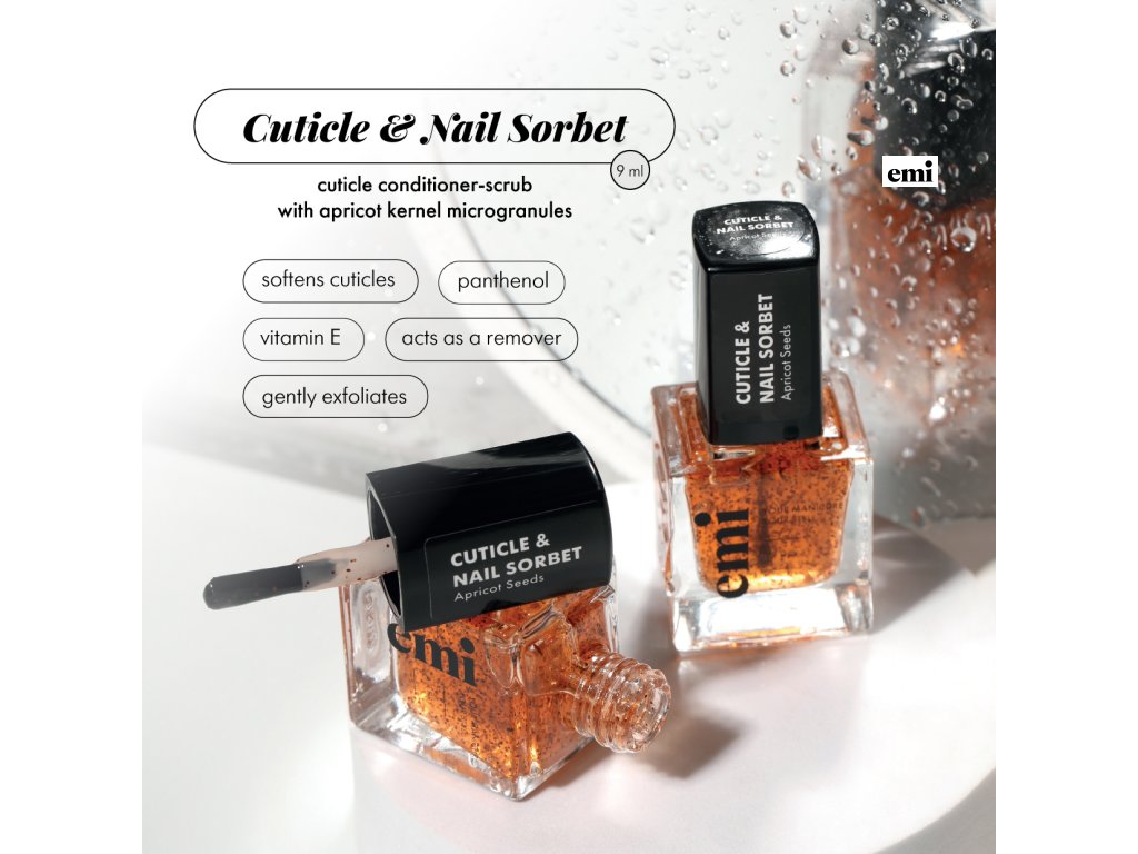 Cuticle&Nail Sorbet je unikátny obnovujúci peeling na nechtovú kožičku s mikrogranulami z jadier marhúľ. Dokonale zmäkčuje kožičku, hydratuje nechtovú platničku a jemne odstraňuje zvyšky po pilovaní.
