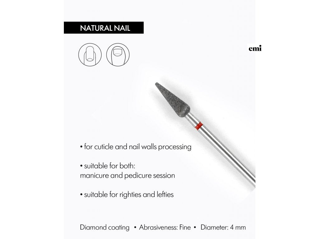 Nevyhnutný nástroj pre každú manikérku/pedikérku. Jedná sa o veľmi presnú rotačnú frézu, ktorá sa používa na opracovanie kutikuly a bočných valov. Jej špeciálne navrhnutá štruktúra robí túto frézu nenahraditeľnou pre manikúru a pedikúru. Tento nástroj šetrí čas urýchlením procedúry a je vhodný pre pravákov aj ľavákov. Diamantový povrch zaručuje dlhú životnosť.