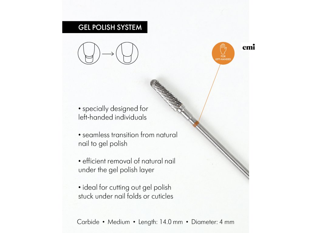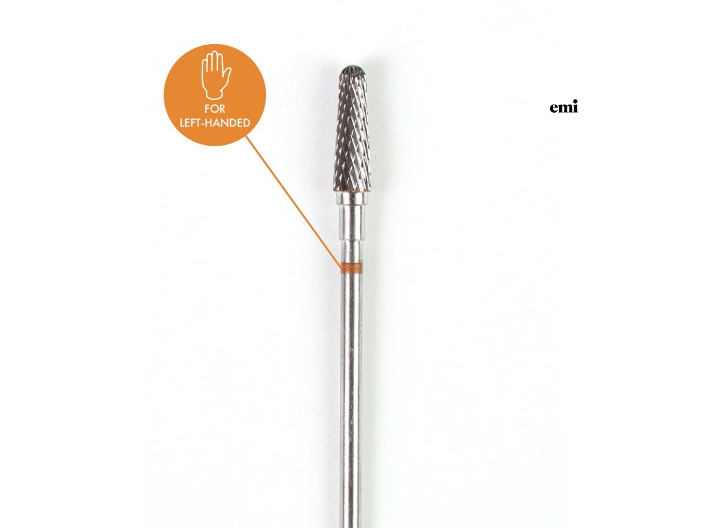 Kužeľová karbidová rotačná frézka pre ľavákov, 4 mm, stredná abrazivita – špeciálne navrhnutá pre ľavákov na presné a precízne odstraňovanie gél lakových vrstiev.